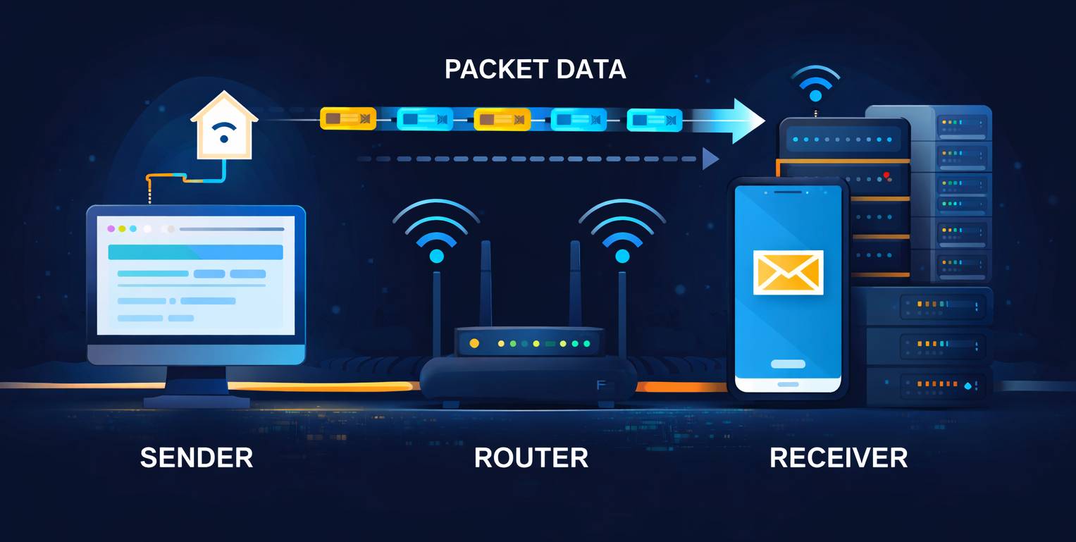 Data yang dikirim melalui internet tidak dikirim sekaligus, melainkan dipecah menjadi bagian kecil yang disebut packet. Setiap packet bisa melewati jalur jaringan yang berbeda.