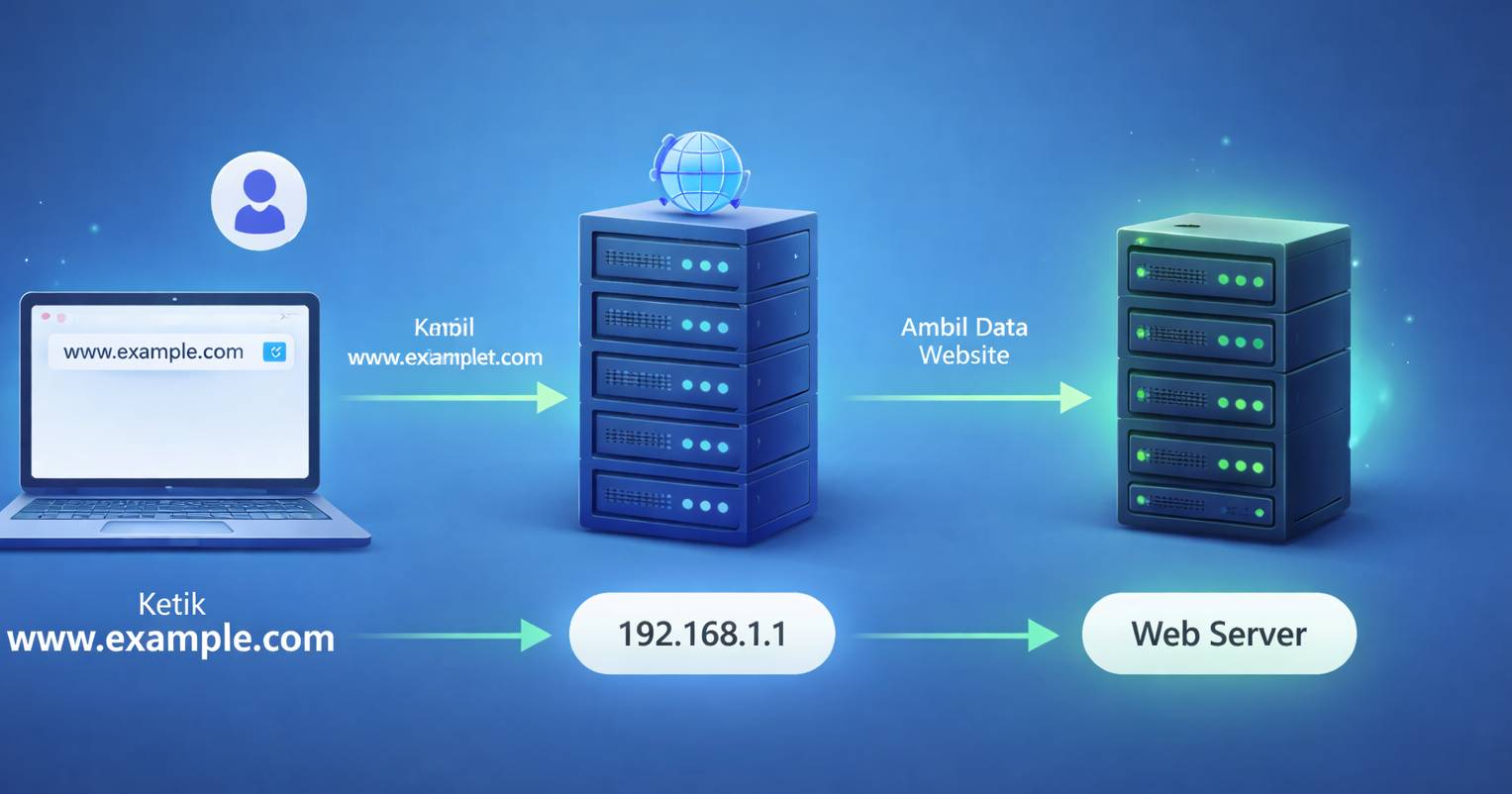 Saat kamu mengetik alamat website seperti google.com, komputer tidak langsung mengerti. Internet menggunakan sistem DNS untuk mengubah nama domain tersebut menjadi alamat IP agar server tujuan dapat ditemukan.